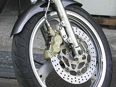 −R1−Zキャリパー− ヤマハのキャリパーは大別して取り付け部分が100mmピッチか83mmピッチ。ピッチが合えばオフセットも合わせて殆ど互換性有り。 で、定番の4POTキャリパー化のチョイスはR1−Z用。が、それなりに効くんだけど思ったほどの効果無し、パッドを選べばいいのかも知れないが、パッド買うぐらいだったらキャリパー換えたい、というわけで早々に交換されてしまった...('_' )。 |